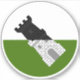 "Par fess argent et vert, une tour en forme de pliage contrechangea sable et argent."