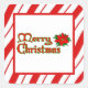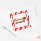 autocollant carré avec une image de rayures de menthe rouge et blanche derrière un centre blanc avec une bordure rouge. Un sentiment de vacances personnalisable. Voir les confettis assortis, le étiquette et le papier d'emballage. Voir la collection entière de Sticker de Noël sous la catégorie CARDS & STICKERS dans la section VACANCES.