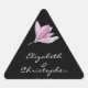 Autocollants triangulaires personnalisés avec une belle couleur de fleur de magnolia violet et votre texte en lettrage blanc chic sur un arrière - plan noir, parfait pour les faveurs de mariage, douche nuptiale, phoques faire-part de mariage et plus encore. Disponible sous différentes formes. OBJETS CORRESPONDANTS dans notre magasin.