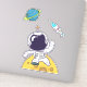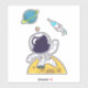 Une vignette avec l'illustration d'un astronaute portant une combinaison astronaute blanche flottant au-dessus de la lune. Au loin se trouve une planète avec des anneaux et un vaisseau-fusée qui s'envole dans le ciel à la recherche de nouveaux mondes à explorer.