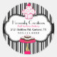 Joli autocollants de boulangerie fabriqués dans un arrière - plan rayé noir et blanc, avec un bracelet noir en gras, au centre, et une zone de texte décorative en blanc bordé de noir, à l'avant. Des graphismes doux d'un cupcake rose, blanc et vert et d'un stand de gâteau avec des brownies, décorent le dessus et le bas, de l'autocollant. Personnalisez le texte rose et noir pour répondre à vos besoins de boulangerie.