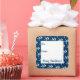 stickers de Noël Starfish pour envelopper les cadeaux. Couleur bleu marine avec motif d'étoiles de mer blanche cet autocollant carré est disponible en deux tailles. Customisez le texte pour dire "Joyeux Noël" ou autre salut. Un panneau de carré blanc au centre est vide pour les noms.