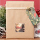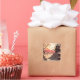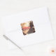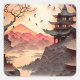 Un bel autocollant carré marron avec une scène découpée en papier représentant l'ancienne construction chinoise, les arbres, les montagnes et le lac.