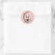 L'autocollant rond personnalisé a une chouette vectorielle rose, noir et blanc sur une branche en forme de lune croissant avec des feuilles verts sur un arrière - plan rose personnalisable.