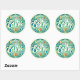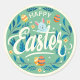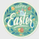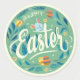 Un design circulaire avec le texte "Happy Easter" dans une police ludique et cursive. L'arrière - plan est un vert tendre avec des éléments décoratifs tels que des oeufs colorés de Pâques et un mignon lapin bleu qui s'éveille. Autour du texte, des motifs fleuris et feutrés, dans des tons verts variés, apportent une touche festive.