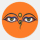 Les yeux calmes et hypnotisants du Bouddha regardant d'un autocollant. L'art vintage est peint à la main dans les tons bleu cobalt, rouge, jaune et vert. Vous pouvez modifier l'arrière - plan de couleur orange en utilisant le bouton personnaliser, réduire également la taille de la conception de l'oeil pour convenir, et même ajouter votre propre texte ou dire.