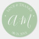 Ces autocollants de mariage simples présentent les initiales monogrammées de la mariée et du marié en typographie blanche sur un arrière - plan moderne vert sage. Utilisez les champs modèle pour ajouter votre texte personnalisé. Un choix élégant mais moderne pour les mariages et les douches nuptiales préférées.