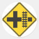 Cette conception est un panneau routier de passage à niveau. Le panneau est jaune avec un passage à niveau et des voies ferrées. Ce panneau routier de croisement de chemin de fer a l'air superbe sur ce Stickers