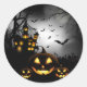 Grand autocollant rond avec une impression citrouille hantante Halloween. Customisez cet objet ou achetez tel quel. com.