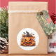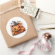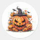 Un autocollant rond est présenté avec une impression d'art citrouille d'Halloween festive. Grande taille affichée Personnaliser cet article ou acheter tel quel.