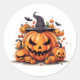 Un autocollant rond est présenté avec une impression d'art citrouille d'Halloween festive. Customisez cet objet ou achetez tel quel.
