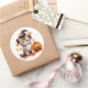 L'autocollant rond est représenté avec un imprimé d'art de chatte Halloween. Customisez cet objet ou achetez tel quel.