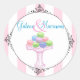 Stickers Macarons et Gateau, avec un cadre gribouillé et des rayures roses et blanches. Placez sur vos forfaits, personnalisez le nom si vous le souhaitez et envoyez ! Copyright Paulette Kinney / Paper Nosh LLC et Paper Patisserie a Zazzle store. Tous droits réservés.