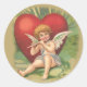 Une très jolie illustration vintage de la Saint-Valentin fait un joli autocollant ou sceau d'enveloppe. Cupid est assis sur le sol, reposant contre un immense coeur rouge et jouant de la flûte. Très mignon.
