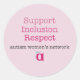 L'image a le texte dans une police de machine à écrire : "Support / Inclusion / Respect" en gradations de rose ; "réseau de femmes autistes" en noir ; et ci-dessous est le logo AWN.