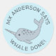 Un joli narval sur un arrière - plan bleu marine clair. Le texte dit "Mx Anderson dit Whale Done !" et peut être modifié pour un nom/message personnalisé. Idéal pour les enseignants comme récompenses pour les étudiants.