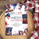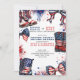 4. Juli thematisch Gender Reveal Einladung in rot weiß und blau. Die Einladung trägt den Titel "Stiefel oder Bogen .. was wird unser kleiner Feuerwehrmann sein?" und ist gerahmt mit Feuerwerken, Western Stiefeln und trendigen Bögen mit amerikanischen US Flagge.