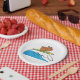 Ein Bulldogge im Stil eines Cartoon, der auf einer Welle surft. Dieses Design wirkt auf diese Paper-Teller sehr effektiv