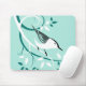 Stilisierte Vogelkunst auf Mousepads mit einem Nuthatch auf wirbelnden Musterkleidern und dekorativen Blätter auf hellblauem Hintergrund.