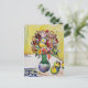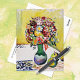 Eine Kunstpostkarte mit dem Gemälde Still Life Blume und Drei Äpfel (1910) des deutschen Expressionisten August Macke (1887-1914). Ein Strauß mit Wildblumen in einer grünen Vase auf einem Tisch mit Früchten vor gelbem Hintergrund.