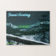 Eine Nachtszene im Norden. Die Nacht ist gefallen, und am Horizont gibt es einen Hauch von Nordlichter jenseits der Berge. Das Mondlicht reflektiert die verschneite Landschaft. Eine Eule sitzt in einem toten Fichtenbaum auf der Suche nach Volen. Text liest "Die Grüße der Jahreszeit" erscheint in blau und weiß.