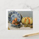 Eine schöne Kunstpostkarte mit dem impressionistischen Gemälde Stillleben mit Melon (1872) von Claude Monet (1840-1926). Ein lebendiger Tisch mit einer reifen Melone und Pfirsichen neben einer blauen und weißen Porzellanplatte.