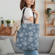 Die Tote Tasche ist mit dunkelblauen Blume versehen.
