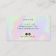 Schönes hairstylistisches Visitenkartendesign mit bunten holografischen Texturen in Imitaten, schwarzen Farbblöcken, Scheren und elegantem Kalligraphie-Schriftart.