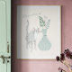 Diese stilvolle Wandkunst zeigt eine hübsche Abbildung einer grauen Katze, die neben einer aquamarinen grünen Vase mit Blumen und Botanikalen stehend ist. Personalisieren Sie es mit Ihrem Namen in handgeschriebener Skripttypografie. Gutes Geschenk für Katzenliebhaber.