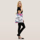 Moderne Brautttasche mit leuchtend rosa Rose, blaues und graues Blattwerk auf weißem Hintergrund. Text kann angepasst werden.