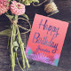 Dieses Geburtstagskartendesign enthält die Worte "GLÜCKLICHER GEBURTSTAG", geschrieben in einem lila Gradienten handgeschriebenen Kalligraphieskript-Schriftart auf einem rosa botanischen Hintergrund.