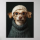 Ein niedlicher Hund mit Brille, eine Strick-Mütze und ein Rollkragenpullover, der ein scholares und modisches Ambiente ausstrahlt.