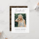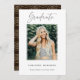 Stilvolle Abschluss-Ankündigungskarte mit dem Foto des Absolventen mit "Graduate" in moderner Schrift. Personalisieren Sie das Foto, indem Sie den Namen des Absolventen, den Namen der Schule und das Jahr des Abschlusses hinzufügen. Die Rückseite weist ein abstraktes goldenes Kreismuster auf braunem Hintergrund auf. Die Hintergrundfarbe auf der Rückseite kann angepasst werden.