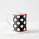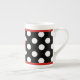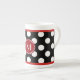 Spaßschwarzweiss-Polkapunkt-China-Tasse, mit einem dünnen roten Band, auf der Spitze und der Unterseite des Polkapunktmusters. Ein rotes Disc, auf der Front der Schale, hat ein weißes Buchstabemonogramm. Personifizieren Sie den Buchstaben für selbst oder als große Geschenkidee. Schöne Schale für Ihren Morgenkaffee oder -tee.