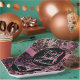 Ein stilvolles, schwarzes, dramatisches Blumenmuster, das in einer schimmernden rosa, blauen Kulisse überragt ist. In der Mitte befindet sich ein schwarzer Kreis, in dem Sie Ihre Veranstaltung mit einem Buchstaben, Logo und Namen personalisieren können. Bezaubernde, schicke, gmädchenhafte Vibes. Teil der stilvollen Black Floral Monogram Collection.