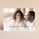 Moderne staubblaue Ankündigung Datum freihalten mit Ihrem Foto überlagert mit "fröhlich immer danach" in einem stilvollen Drehbuch mit Swashes und Ihren Namen und Hochzeitstermin verbunden mit einem Herz. Auf der Rückseite, personalisieren Sie Ihre Ankündigung in eleganter weißer Typografie auf einem staubblauen Hintergrund und geben Sie Ihre Website-Adresse, um einen QR-Code für Ihre Gäste zu scannen, um Hochzeitsaktualisierungen und Details.