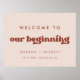Herzlich willkommen auf unserem Beginnsign. Ein Retro-Chic-Thema: adoptier dieses leicht Vintage und stilvolle typografische Design für Ihre Hochzeitsarbeit mit einem verbrannten Orange, Terrakotta, braunem Zucker und pfirsichrosa Thema. Vollständig anpassbarer Text, Farben und Hintergrund.