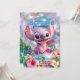 🌸 Invitation Description The image is an invitation card with a tropical, whimsical, and colorful theme, centered around the Disney character Stitch (from Lilo & Stitch). Character: A smiling, mischievous Stitch is featured prominently in the center. Theme: The background is lush and green with large, blurred tropical leaves and bright pink hibiscus flowers visible at the bottom. The atmosphere is festive. Color Palette: It uses bright, saturated colors, particularly vibrant blues, greens, and pinks. The background has an iridescent or holographic effect.