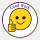 Belohnen Sie den Aufkleber mit einer niedlichen, runden gelben Seite, die das Daumenschild nach oben zeigt. Er hat zwei schwarze Punkte für Augen und ein glückliches Lächeln. Über seinem Kopf stehen die Worte "Gute Arbeit" in lila Schrift. Dies ist eine Vorlage, mit der Sie die Nachricht auf Ihren eigenen Wunsch ändern können.