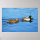 Männlich und weiblich von Stockenten (Anas platyrhynchos - Bird) in indianischer Datei, die auf blauem Wasser schwimmt