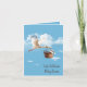 Storch in Wolken mit einem kleinen Jungen in einem Korbkorb. Alle Texte können geändert werden.