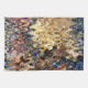 Ein farbenprächtiges abstraktes Design aus Algen, Sand und Muscheln am Strand.