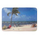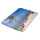 Die farbenfrohe Jahreszeit auf dieser großen Badematte ist ein Originalfoto von ZoeSPEAK eines Strandes in Key West, Florida. Der Himmel ist tief blau mit puffigen weißen Wolken. Die Sonne scheint auf dem warmen, gelben Sand und ein Steg erstreckt sich entlang des Horizonts des blauen Wassers des Ozeans. Eine einsame Kokospalme liegt am Ufer des Meeres und bietet den Gästen, die am Strand sitzen, einen kleinen Schatten.