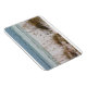 Foto eines Strandzugangs mit Surfbrettern, Strand- und Grasflächen und Pfad zum Strand.