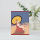 Vintage Darstellung einer hübschen jungen Dame, die sich unter einem Sonnenschirm auf dem Sand in einem Liegestuhl niederlässt. Sie können den Ozean hinter sich sehen.