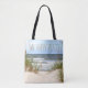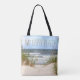 Tote Tasche mit einem abgefangenen thematischen Foto, auf dem Wellen, Sand, blauer Himmel, Strandrasen und das Zitat "Mein glücklicher Ort" gezeigt werden.