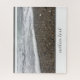 Dieses Design in natürlichen Erdfarben von grauem und braunem Zentrum rund um ein Foto am Meer. Auf diesem Bild ist weißes Wasser aus einer Meereswelle, die gebrochen ist und sanft auf der Küste rollt. Es gibt einen eigenen Text auf diesem Stück, um es zu personalisieren.