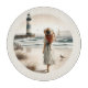 Eine anmutige junge Frau in einem fließenden weißen Kleid wandert entlang des Sandstrandes, ihre Sonnenhut neigte sich gegen die Brise, während sie auf einen gestreiften Leuchtturm blickt, der stehend gegen die Wellen stark ist. Die sanften Gräser umrahmen den Vordergrund, während Seevögel und ein Segelboot über den Horizont treiben und der Küstenlandschaft ein Gefühl der Ruhe verleihen. Der sanfte Aquarellstil verbindet Romantik und Ruhe und schafft so eine zeitlose, von Kernelementen inspirierte Meereslandschaft, die sich sowohl nostalgisch als auch traumhaft anfühlt. AI generierte Kunstwerke.