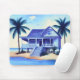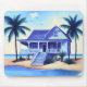 Mouse Pad in einem bezaubernden Strandhaus mit einer Veranda liegt zwischen zwei großen Palmen, gegenüber einem ruhigen Ozean unter einem hellen, klaren Himmel.