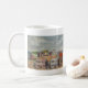 Diese Tasse zeigt ein originelles Ölgemälde von Anna Unterman von einer kleinen Insel vor der Küste von New Jersey. Eine whimsikale Gruppe von Strandhäusern liegt um einen zentralen Sandhof mit einer farbenfrohen Wäscheleine, die in der Brise weht. Jedes Haus hat eine andere pastellfarbene Farbe: rosa, blau, weiß, grün und braun. Die Bucht liegt im Hintergrund mit einem Segelboot. Der Himmel ist teilweise bewölkt. Reprint mit Genehmigung des Anwesens von Anna Unterman. Alle Rechte vorbehalten.